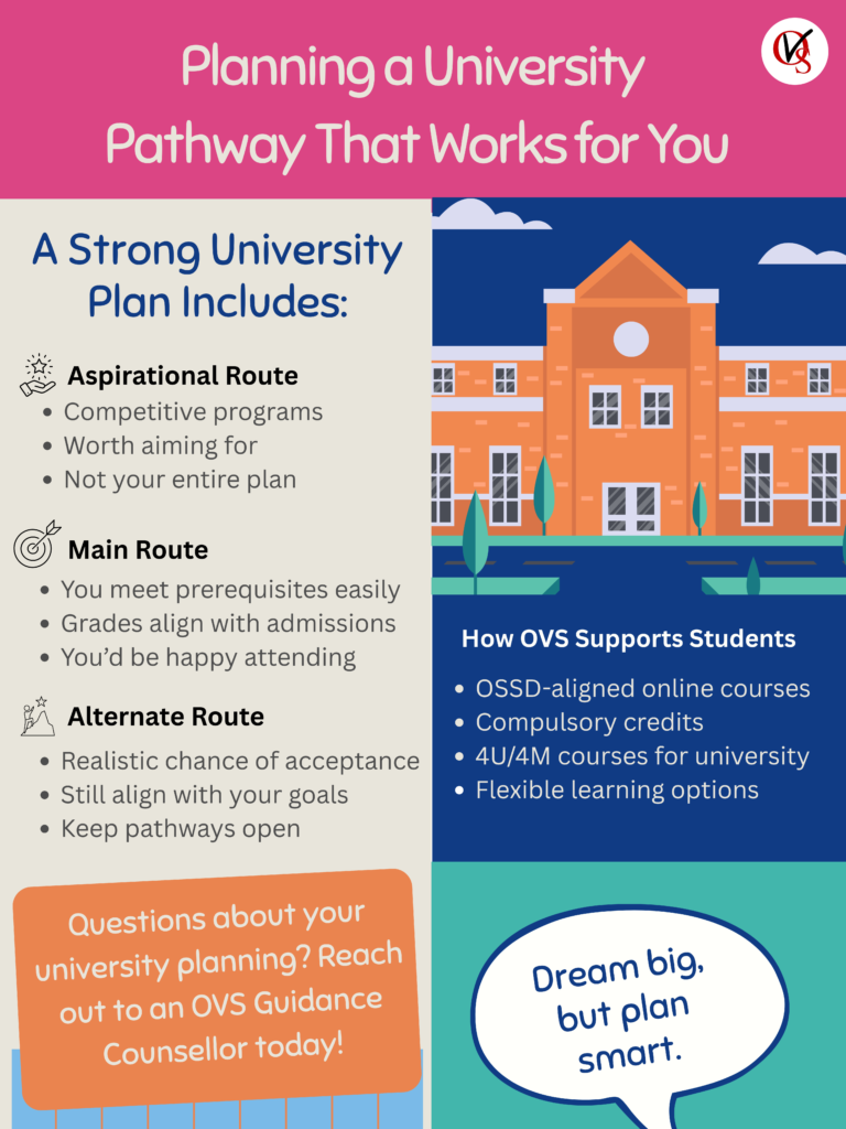 This is where many students get stuck. An alternate route is not: “A random school I don’t actually want”; “Whatever is left” or “The closest option, just in case”. A real alternate route is a program you’d still genuinely attend with a realistic chance of admission and one that still keeps you moving toward your long-term goals. For example, this might be a different campus, a slightly less competitive version of the same program, a related program that keeps future career paths open or a pathway or transfer-friendly option.